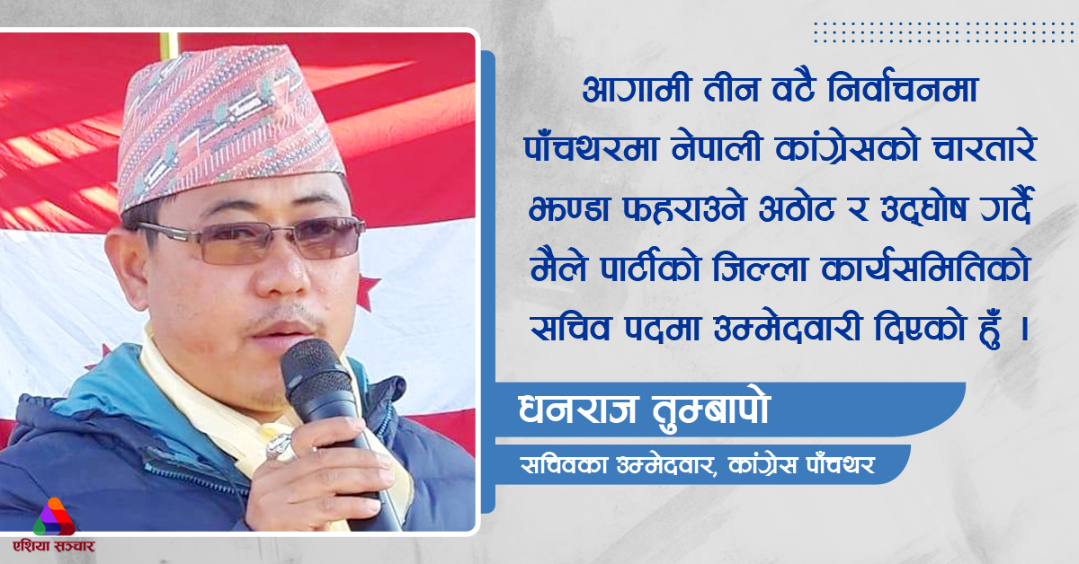 ‘आगामी जिल्ला अधिवेशनबाट सचिव पदमा निर्वाचित भएर पाँचथरमा नेपाली कांग्रेसको संगठन सशक्त बनाउने अभियान होमिने छु, सबै स्थानीय तह, प्रदेश र प्रतिनिधिसभामा नेपाली कांग्रेस विजयी हुने आधार निर्माणका लागि अहोरात्र खट्ने उद्घोष गदर्छु,’ तुम्बापोले भने ।