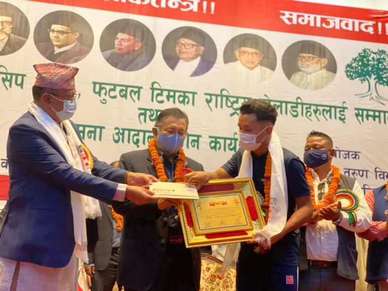 सम्मान कार्यक्रमका सभापति पासाङ नोर्बु शेर्पाले अन्तर्राष्ट्रिय स्तरमा देशको नाम चिनाउने राष्ट्रका गहना खेलाडीलाई सम्मान गर्न पाउँदा तरुण विभाग आफै सम्मानित भएको बताए । उनले खेलाडीलाई खेलमामात्र केन्द्रित हुन आह्वान गर्दै भने, ‘नेपाली काग्रेस तरुण विभाग तपाईहरुको साथमा छ । तपाईहरुका लागि आवश्यक सबै काम गर्न हामी तयार छौं । तपाईहरुका समस्या हामीलाई भन्नुस्, त्यसका लागि हामी लड्छौं । तपाईहरु चाँही मैदानमा देशका लागि विदेशीसँग लड्नुस । फुटबलमै केन्द्रित हुनुस । खेलाडीको साथ र सहयोगका लागि तरुण विभाग सधै तयार छ ।’