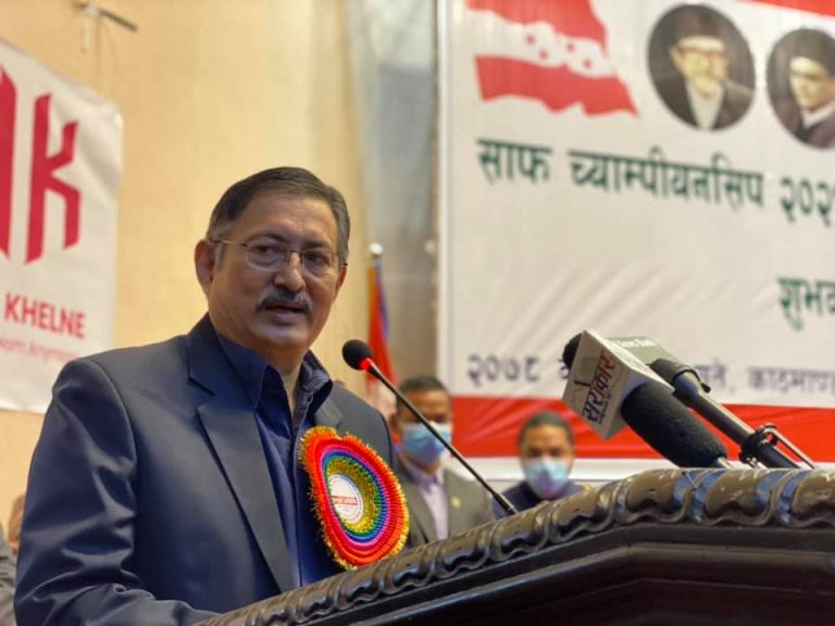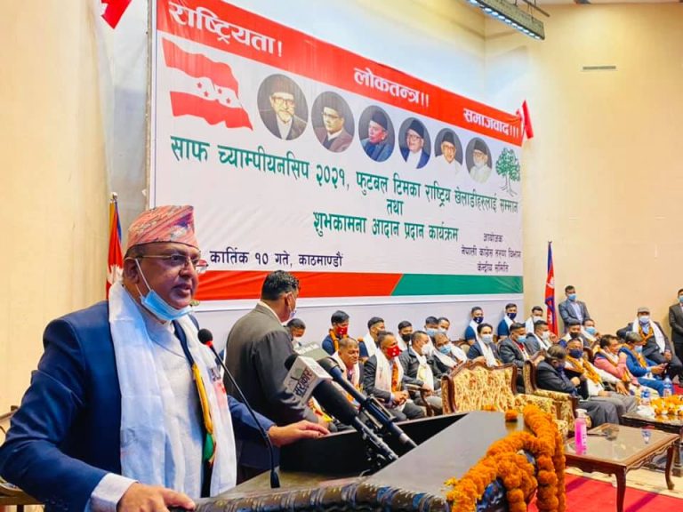 ‘साफ च्याम्पियनसिपमा उपविजेता भएकोमा सम्पूर्ण खेलाडी तथा अफिसियल टोलीलाई बधाई । कप्तान किरण चेम्जोङ यहाँ उपस्थित नभए पनि मैले व्यक्तिगत रुपमा फोन गरेर बधाई दिएको थिएँ र पदकबाट सम्मान गर्न चाहेको कुरा बताएको थिएँ,’ उनले भने, ‘अर्काे पटक साफ च्याम्पियनसिपको विजेता टोली बनेर आउनुहोस्, सरकारले तपाईहरु सबै खेलाडी, प्रशिक्षक र अफिसियललाई राष्ट्रिय तक्माबाट सम्मानित गर्नेछ ।’