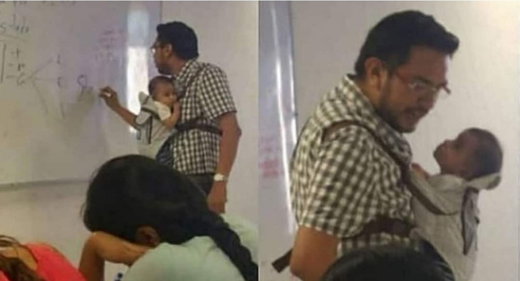 तस्बिरहरूमा तपाईले स्पष्ट देख्न सक्नुहुन्छ, एक व्यक्तिले आफ्नो बच्चालाई पेटमा बोकेर बच्चाहरूलाई पढाउँदैछन् ।यस क्रममा उनले बालबालिकालाई पढाउने मात्रै नभएर आफ्नो बच्चाको हेरचाह पनि गरिरहेका छन् ।