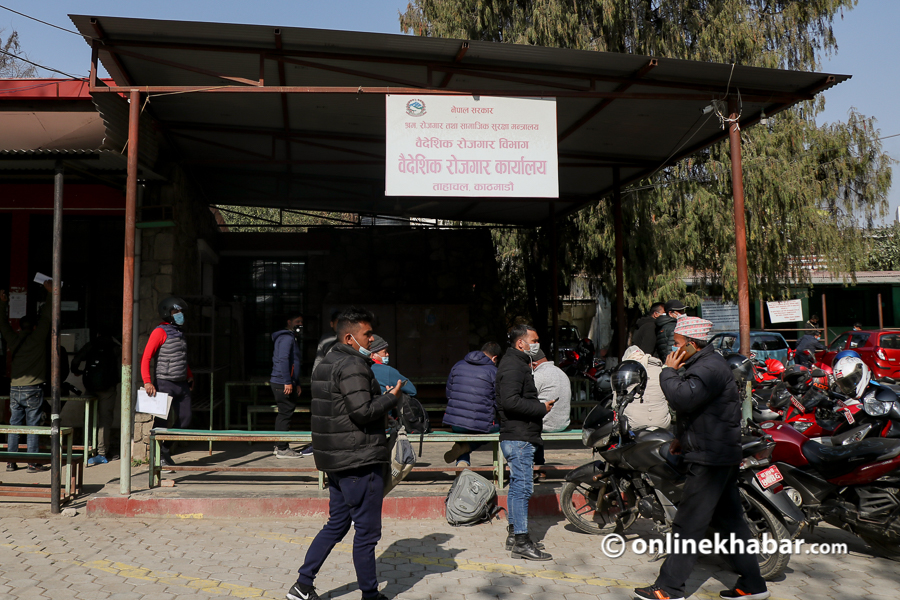 काठमाडौं, वैशाख २७ गते। वैदेशिक रोजगार कार्यालय, काठमाडौंले नयाँ व्यक्तिगत श्रम स्वीकृतिको काम पनि अनलाइन प्रणालीबाट मात्र हुने व्यवस्था गरेको छ। कार्यालय प्रमुख रमेश अर्यालयले आँउदो जेठ ६ गते देखि अनलाइन प्रणालीबाट मात्र नयाँ व्यक्तिगत श्रम स्वीकृति दिने निर्णय भएको जानकारी दिए।