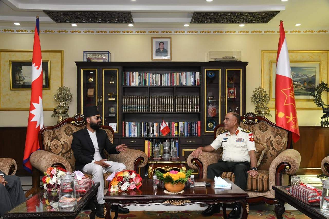 काठमाडौं, जेठ १६ गते । काठमाडौं महानगरपालिकाका नवनिर्वाचित मेयर बालेन शाहले नेपाली सेनाका प्रधानसेनापति प्रभुराम शर्मासँग भेटवार्ता गरेका छन्।