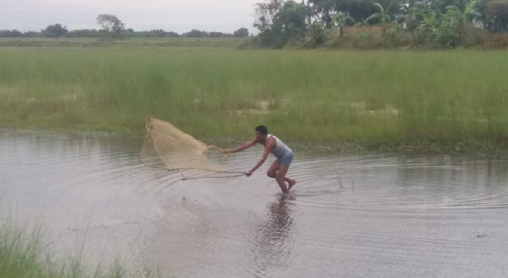 माछा मार्ने व्यक्तिको मुखभित्र नदीबाट उफ्रिएको माछा पसेपछि