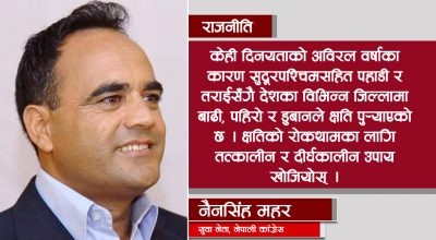 काठमाडौं – नेकपा एमालेको भ्रातृ संगठन अनेरास्ववियुले विगत केही दिनदेखि परेको सुदूरपश्चिम प्रदेशसहित देशभरका विभिन्न स्थानमा आएको बाढी पहिरोले पुगेको क्षतिप्रति ध्यानाकर्षण भएको बताएको छ । अध्यक्ष सुनिता बरालले मंगलबार विज्ञप्ति जारी गरी बाढी र पहिरोले किसानहरूले लगाएको धानबाली नष्ट हुनुका साथै घरवस्तीहरू र मानवीय रुपमा भएको क्षतिले स्तब्ध बनाएको बताएकी हुन् । ‘बाढी र…