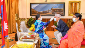काठमाडौं, १० कात्तिक – राष्ट्रपति विद्यादेवी भण्डारीले प्रधानमन्त्री केपी शर्मा ओलीलाई दशैंको टीका लगाइदिएकी छन्।