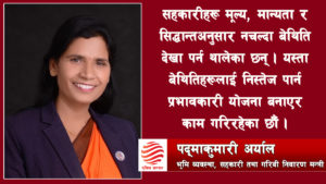 काठमाडौं, ९ भदौ – भूमि व्यवस्था, सहकारी तथा गरिबी निवारण मन्त्री पद्माकुमारी अर्यालले भूमि बैंक