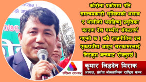 काठमाडौं, ९ भदौ – संघीय लोकतान्त्रिक राष्ट्रिय मञ्चका केन्द्रीय अध्यक्ष कुमार लिङदेन मिराकले कोरोना प्रकोप