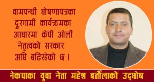 काठमाडौँ, १ जेठ – नेपाल कम्युनिस्ट पार्टी (नेकपा) का युवा नेता महेश बर्तौलाले कोरोना महामारीको